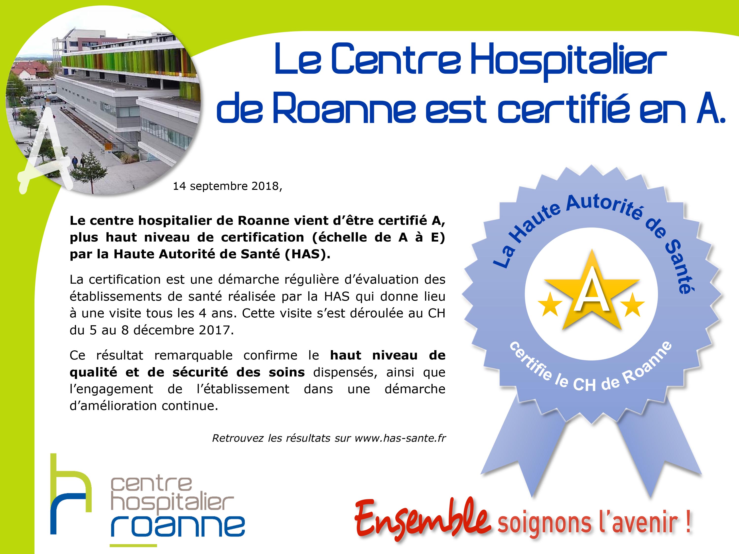 L’établissement réussit brillamment son évaluation globale et rejoint ainsi au niveau national un cercle très restreint d’établissements de santé bénéficiant de ce niveau de certification. En effet, à ce jour, seuls 19% des Centres Hospitaliers sont certifiés en A, valeur qui descend à 7% si l’on considère les seuls établissements comparables à Roanne (Centres Hospitaliers généraux de plus de 100 000 séjours, disposant des 5 types de prises en charge et comptant au moins 4 secteurs à risque).