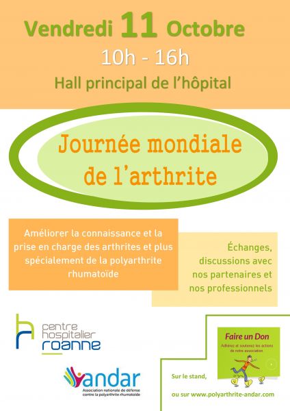 Dans le cadre de la journée mondiale de la polyarthrite, l’ANDAR tiendra un stand d’informations et de sensibilisation au centre hospitalier de Roanne, en présence des Dr MUNGROO et DENARIÉ, rhumatologue du CH :