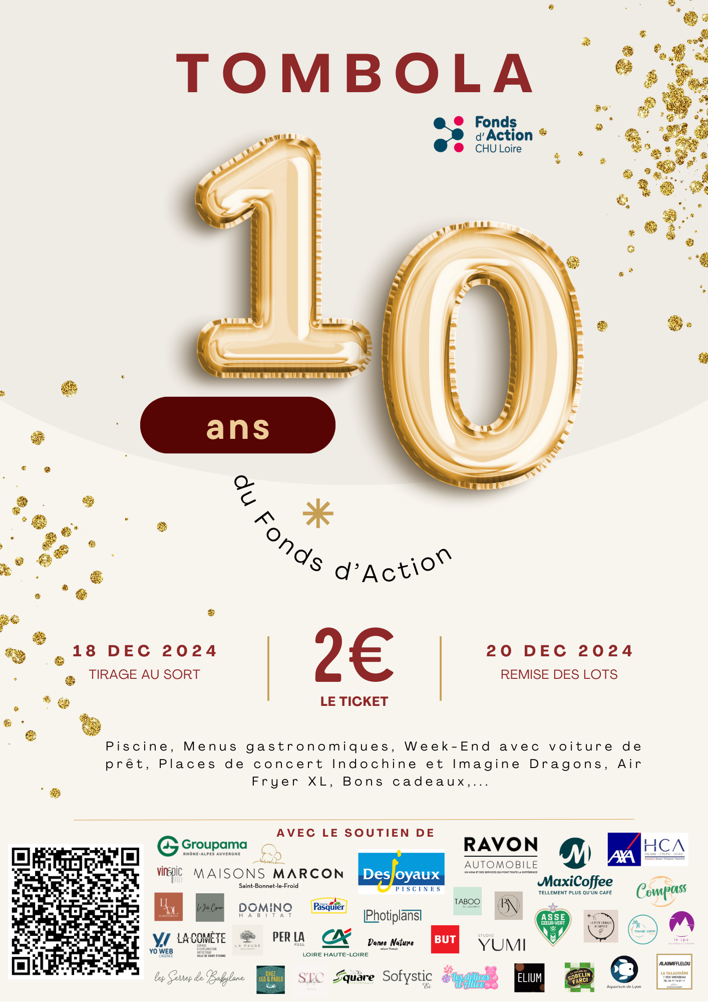 Nous avons le plaisir de vous annoncer le lancement de la grande Tombola d'Anniversaire du Fonds d'Action CHU Loire, à l'occasion de notre décennie d'engagement en faveur des patients, des soignants et de la recherche !