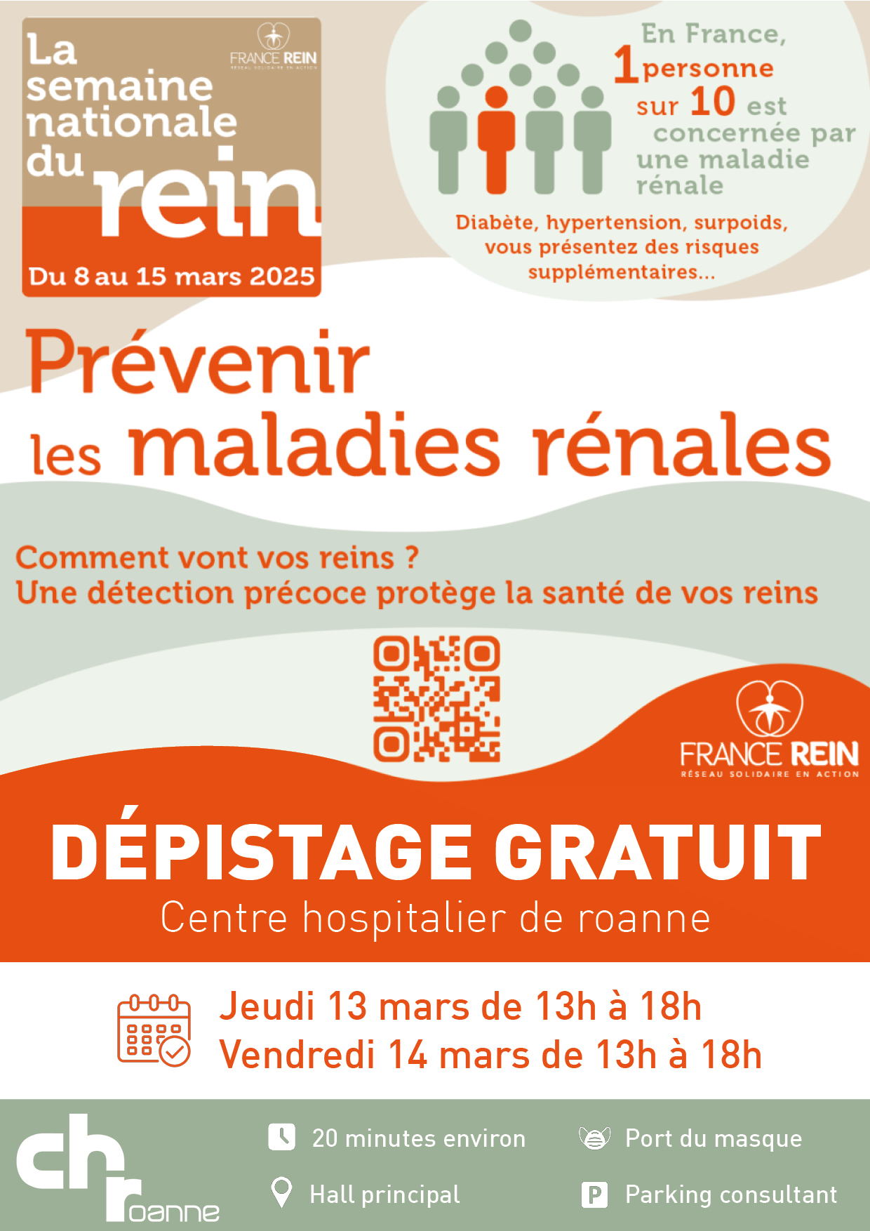Dans le cadre de la semaine nationale du rein et en partenariat avec l’association France Rein, le centre hospitalier de Roanne organise deux demi-journées de dépistage gratuit des maladies rénales par bandelettes urinaires.