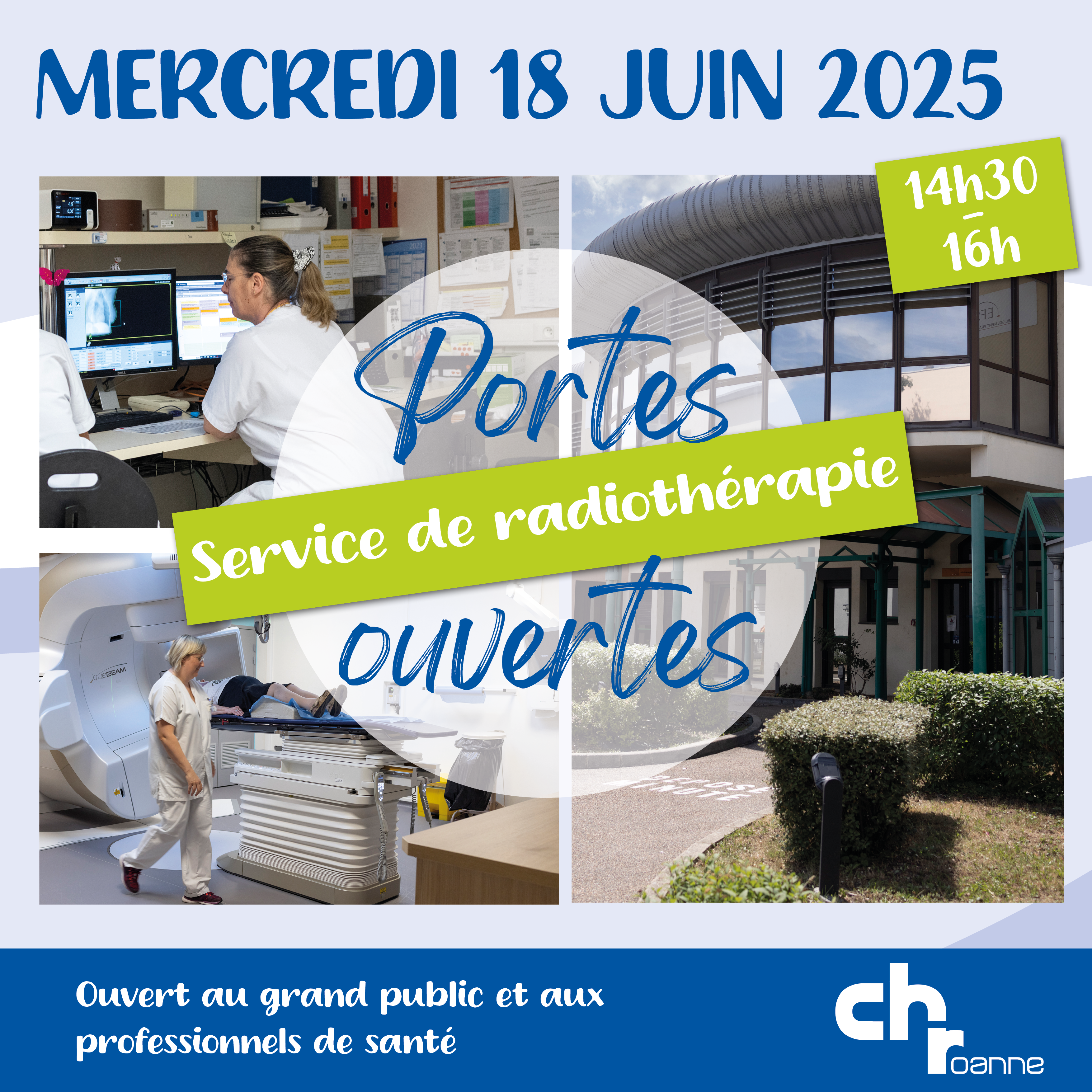 A l’occasion de la mise en service du 2e accélérateur de particules au sein du centre hospitalier de Roanne, le Dr Amel BLANCHARD-REHAILIA, cheffe du service de radiothérapie et toute son équipe sont heureux de vous convier aux portes-ouvertes du service de radiothérapie :