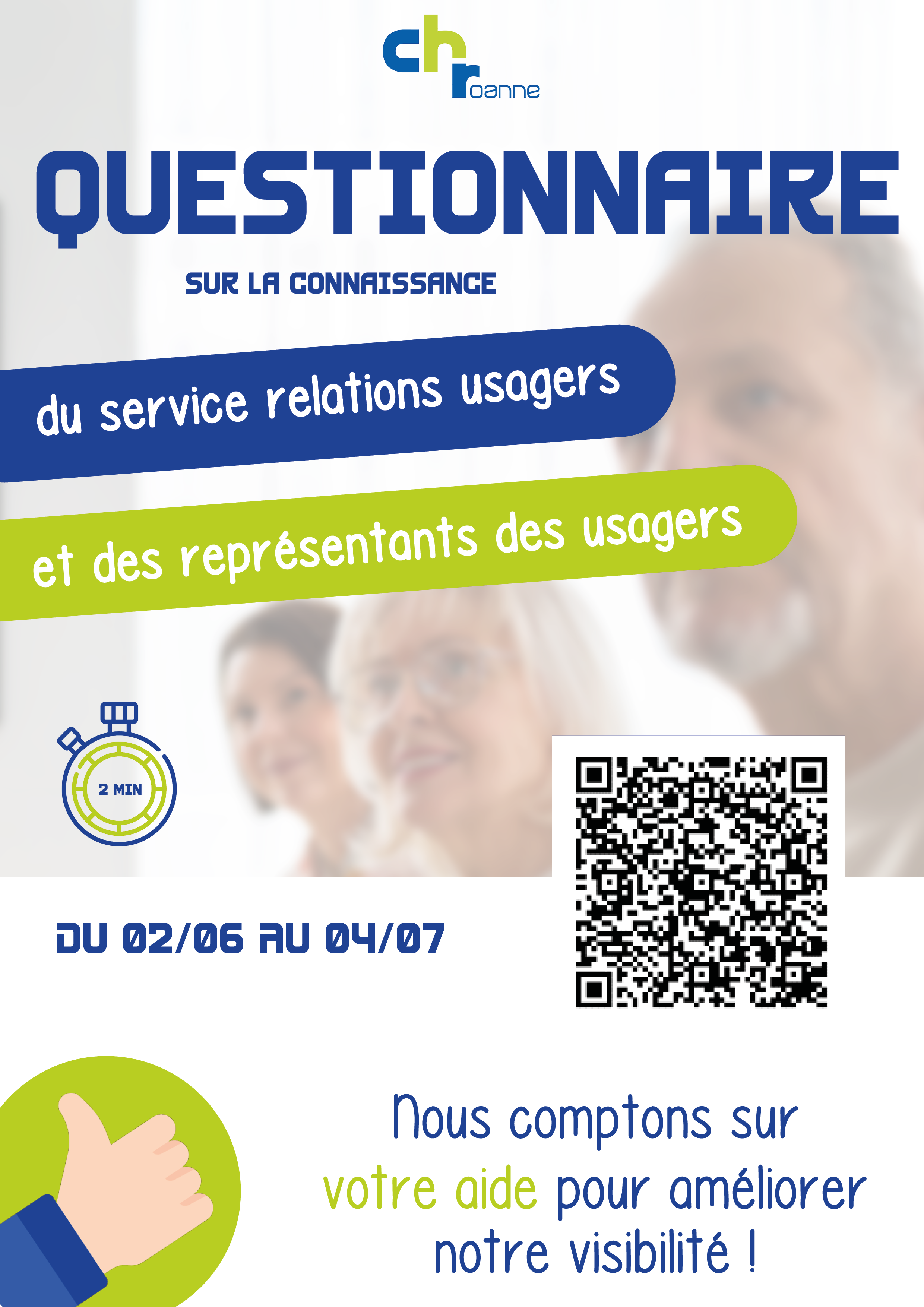 Afin de nous aider à améliorer la qualité de la prise en charge des usagers au sein du centre hospitalier de Roanne, nous vous remercions de prendre quelques minutes pour remplir ce questionnaire.