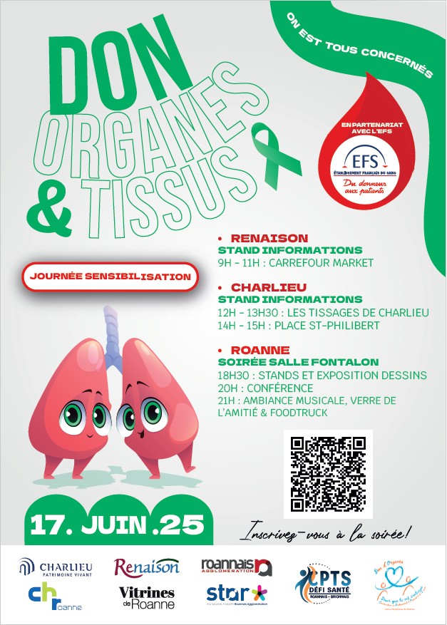 La coordination de prélèvement d’organes et tissus (CHPOT) du centre hospitalier de Roanne organise une journée en partenariat avec la CPTS Défi santé Roannais - Brionnais, Roannais Agglomération, Ville de Roanne, Charlieu, Renaison, les Vitrines de Roanne et la Star Roanne.