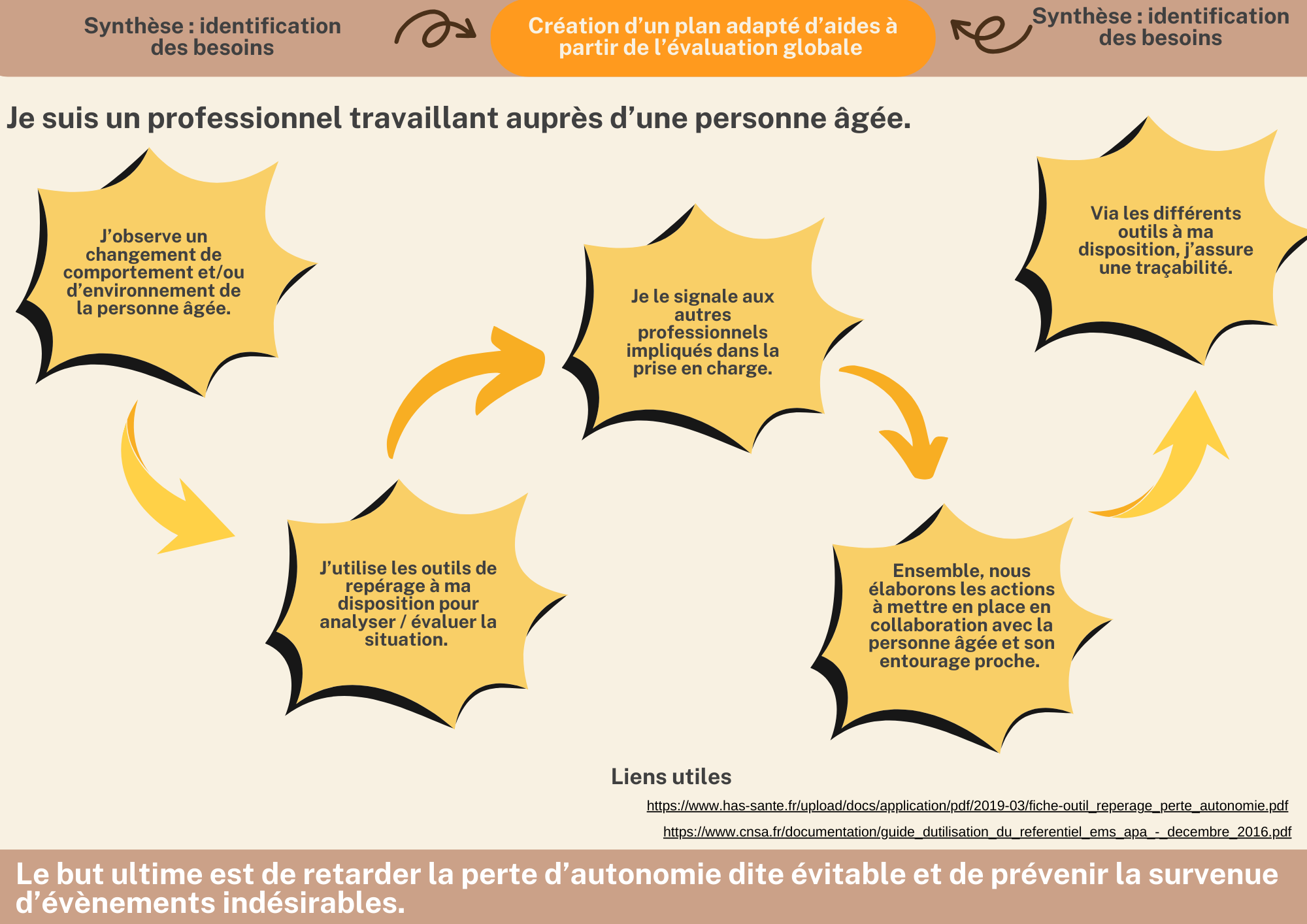 Pour répondre à cet objectif, une fiche « Les essentiels pour une évaluation globale de la situation de la personne âgée » a été créée à partir de plusieurs référentiels en lien avec le sujet.