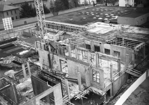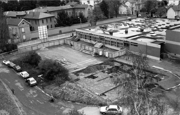 Envisagée dès 1947, la construction d’un nouveau bloc polyclinique répondait à un accroissement du nombre de malades hospitalisés dû, en grande partie, à l’instauration de la sécurité sociale. Après l’abandon d’un premier projet, un second est validé en 1954 et entamé en 1956. Le nouveau bâtiment est prévu sur quatre étages pouvant accueillir 250 lits. Au rez-de-chaussée, les services d’urgence, administratifs et d’électroradiologie, le laboratoire, la pharmacie et la bibliothèque médicale doivent se partager la place avec l’ophtalmologie et l’oto-rhino-laryngologie.