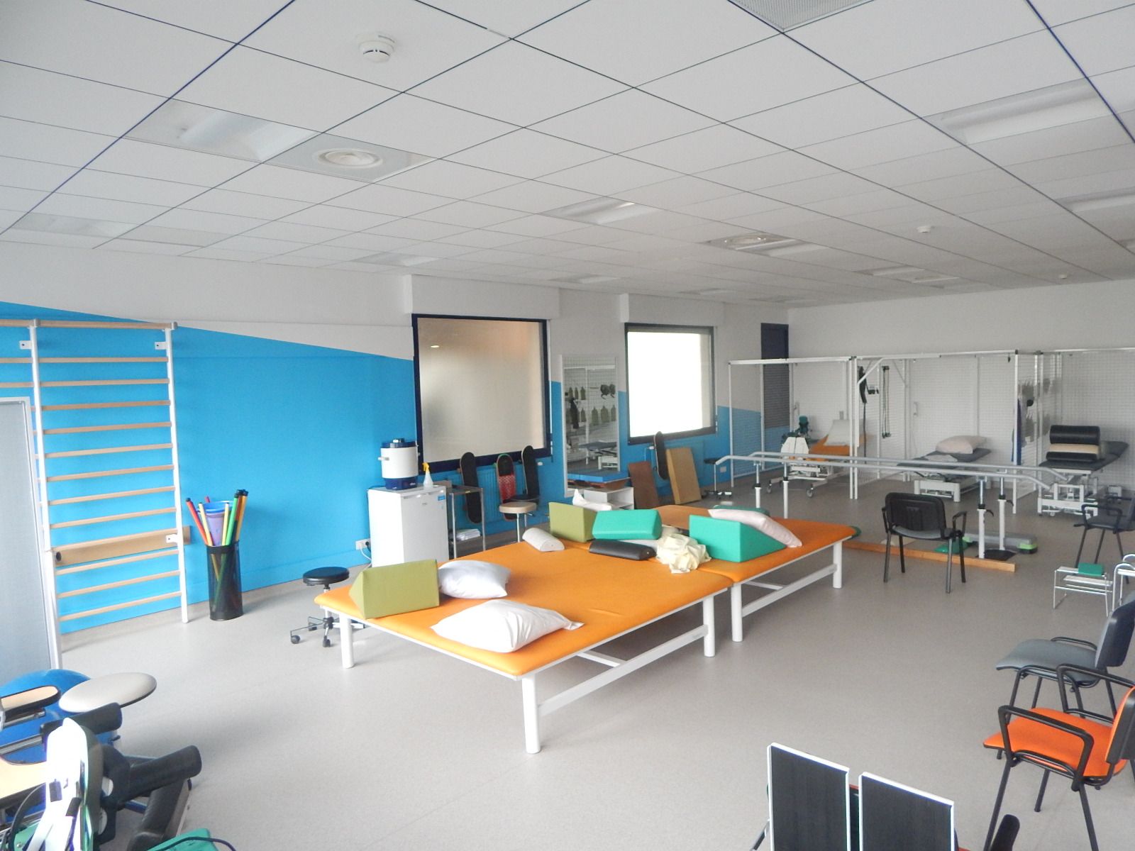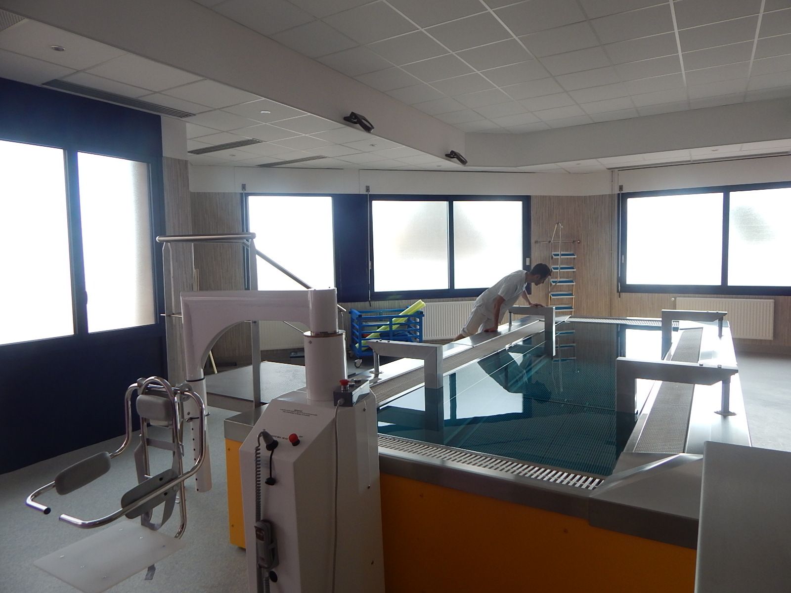 - une partie « sèche » avec des salles pour la kinésithérapie, l’ergothérapie, l’activité physique adaptée, l’aménagement d’un patio extérieur pour le travail de la marche, ainsi qu’une salle de consultation de grand appareillage.