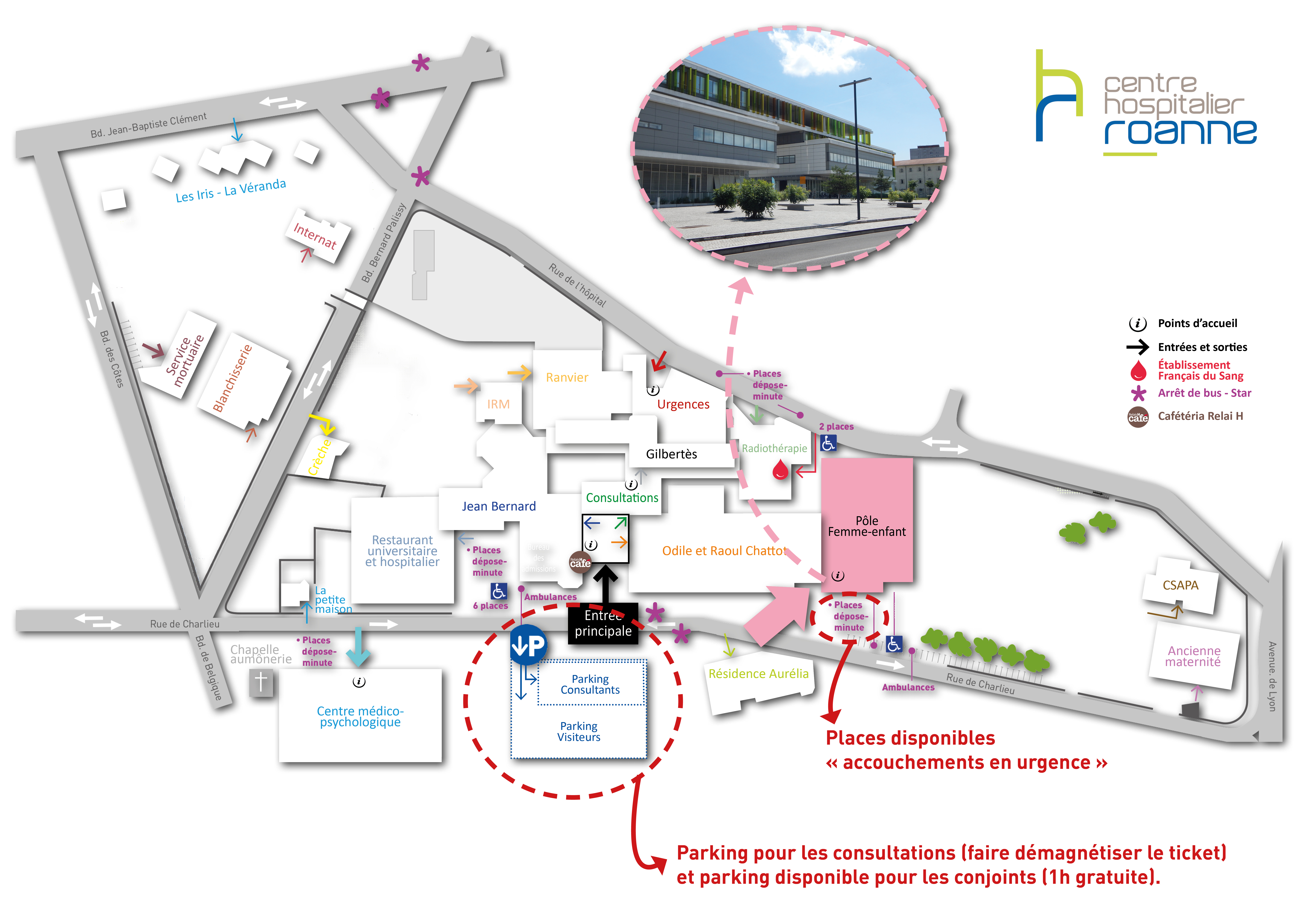 Un parking, situé route de Charlieu, en face du bâtiment principal est réservé pour les consultantes.