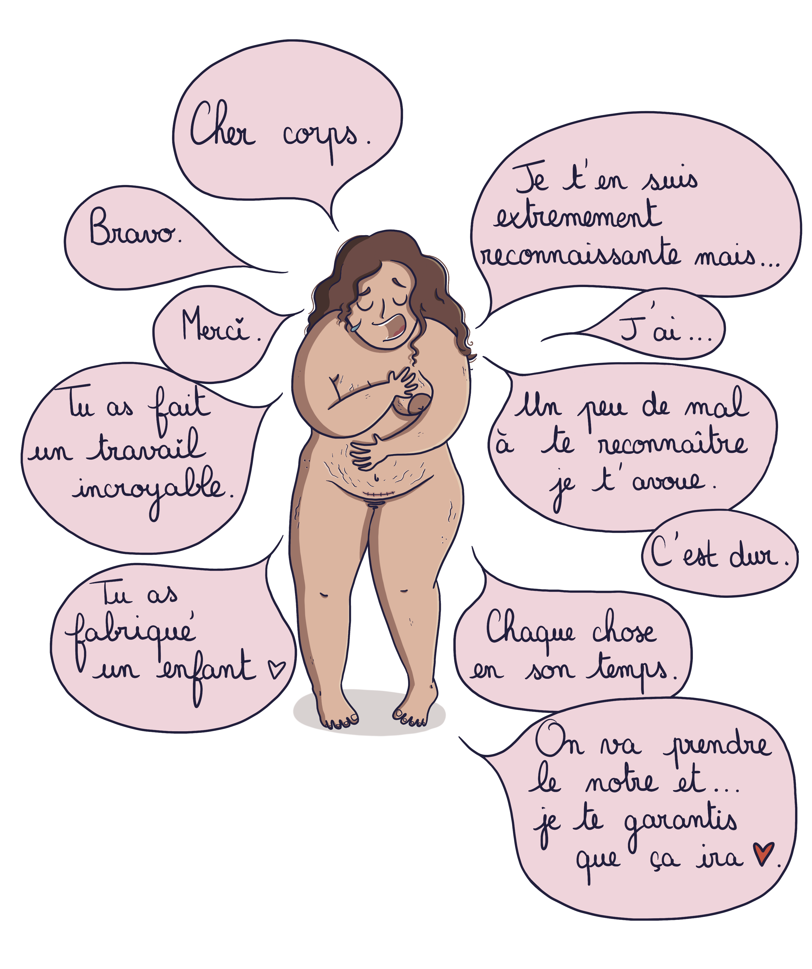 Votre corps a changé. Rassurez-vous, il faut du temps pour se réapproprier son corps et son image (ventre, élasticité de la peau, œdèmes, cicatrices, vergetures, prise de poids etc …).