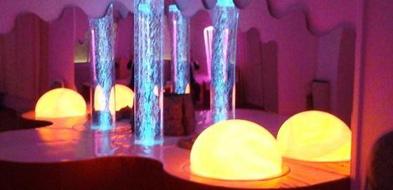 Cet espace est composé d’un lit à eau avec caisson de résonnance, colonnes à bulles, boule magique, vidéo projecteur, matériel hifi, fibres optiques, cascade fluorescente, lumière moire, diffuseur d’odeur, lampe nuage.