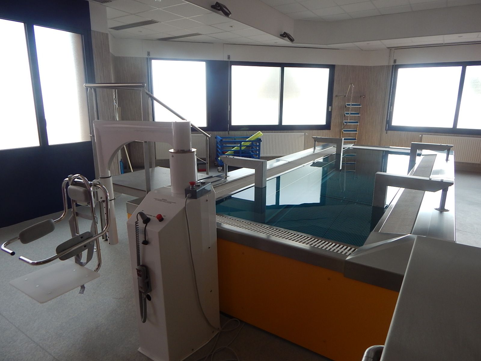 - Une partie balnéothérapie avec la création d’un couloir de marche en eau à immersion variable. Le couloir de marche en eau fait environ 11 m3. Cette technique permet une reprise progressive de l’appui après fracture grâce à la poussée d’Archimède (utilisation idéale en traumatologie pour prothèse d’épaule, etc.). La rééducation en eau chaude (33°C) induit une détente musculaire et la facilite les mouvements et permet une rééducation plus intensive grâce la résistance de l’eau plus particulièrement pour les patients lombalgiques chroniques.